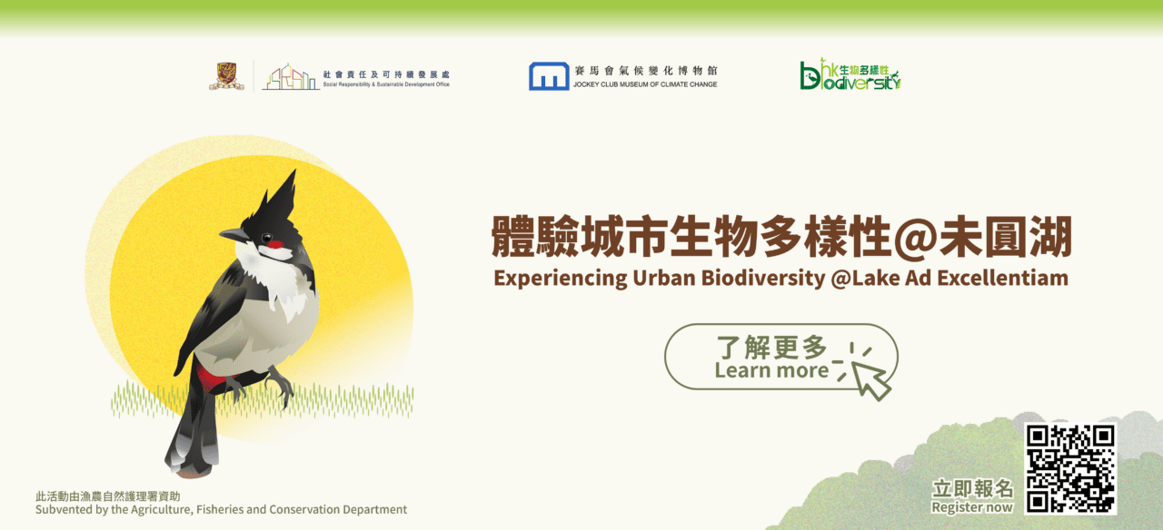 CUHK is home to numerous plant and animal species, and its campus offers a good illustration of how artificial habitats can serve as wildlife habitats in urban areas. This valuable lesson is promoted by ‘Experiencing Urban Biodiversity @Lake Ad Excellentiam’, a community project co-organized by the Social Responsibility and Sustainable Development Office (SRSDO) and the Jockey Club Museum of Climate Change (MoCC) and subvented by the Agriculture, Fisheries and Conservation Department. The project promotes nature exploration and appreciation of local urban biodiversity. Through a virtual learning portal and a series of workshops and outdoor activities around Lake Ad Excellentiam at CUHK, participants can explore and connect with nature while learning about the importance of biodiversity conservation.
