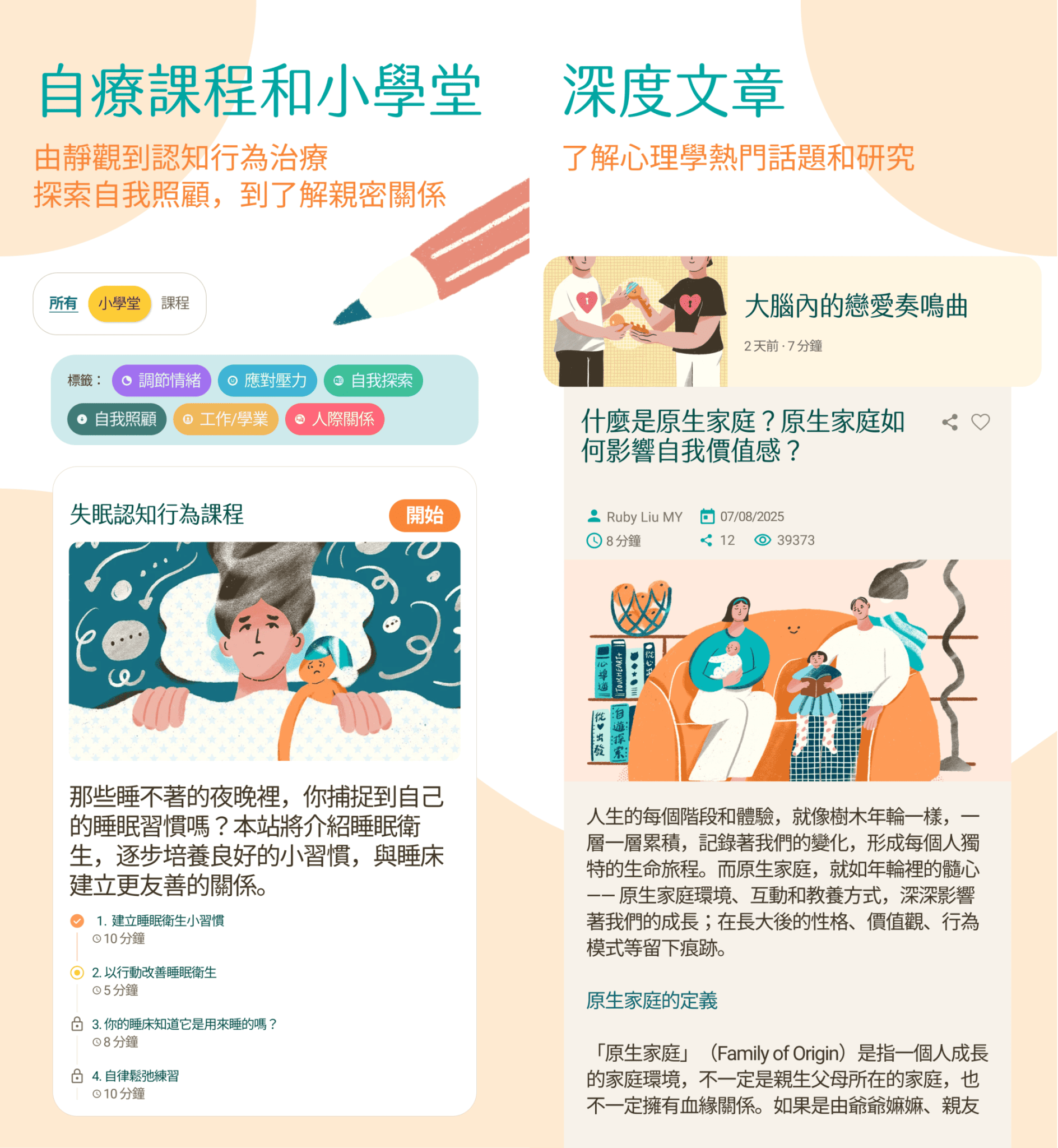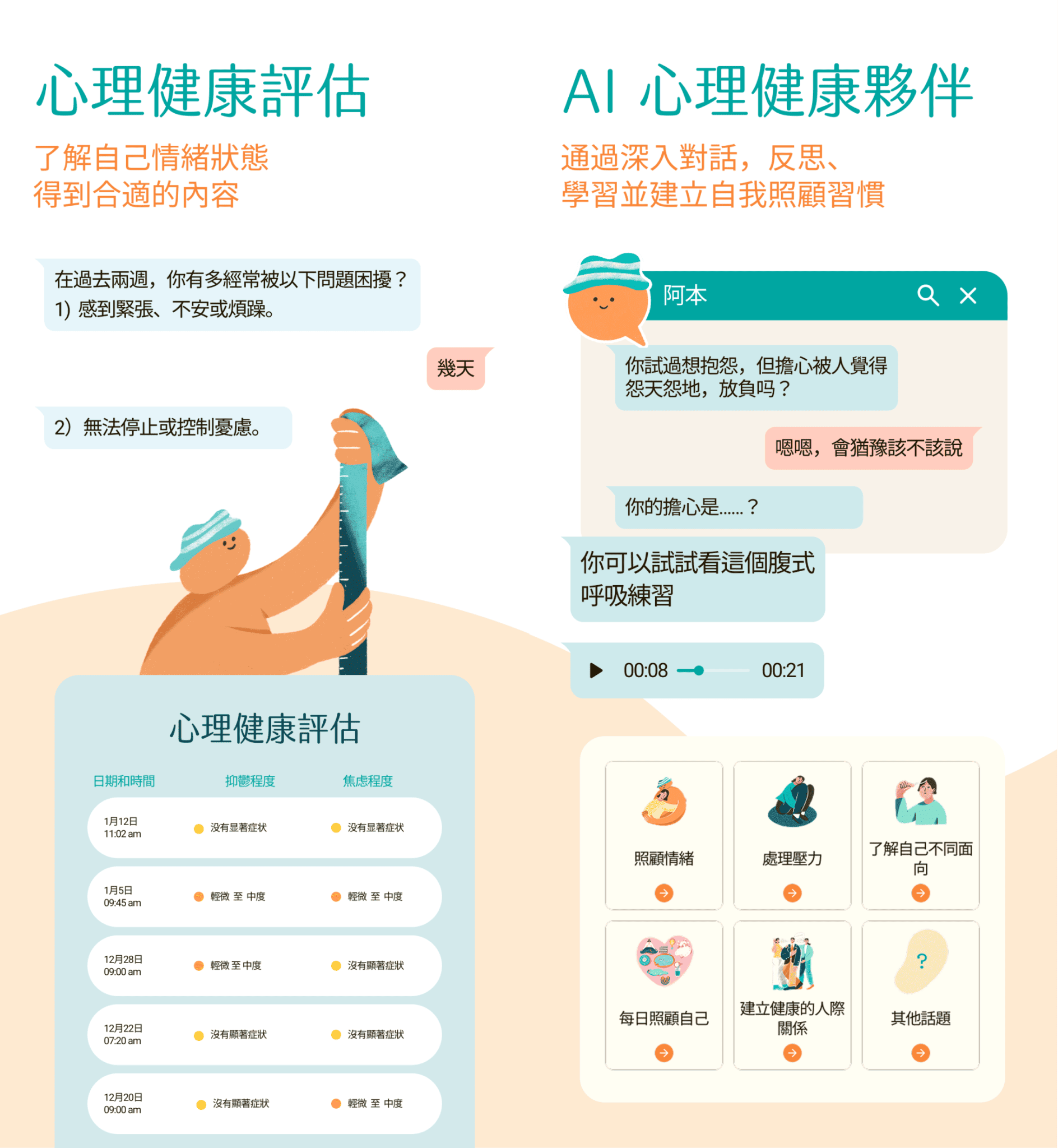 平台设有人工智能心理健康伙伴、临床心理学家督导下编制的自助心理课程和针对特定主题的小学堂,皆可透过支援流动装置的介面轻松使用。