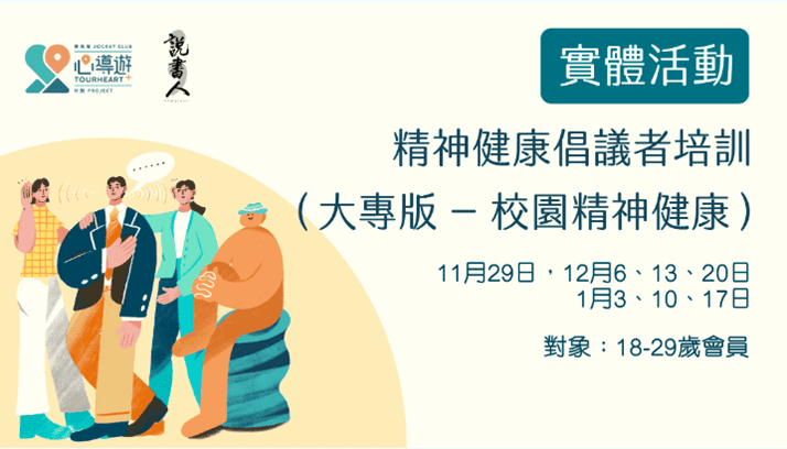 真正推动长远改变的力量,并非仅来自专业人士,而是我们每一位。心导游+团队透过"精神健康倡议者培训(大专版 – 校园精神健康)"积极培育18至29岁的青年。在计划尾声,参加者将在互动工作坊与创意协作中与心导游+协办机构说书人的导师及同侪一起设计出具影响力的公众教育素材,推动校园心理健康,培育出更共融和具同理心的学习环境。